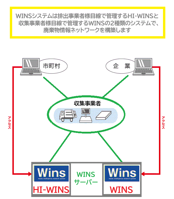 WINSシステムでは、廃棄物管理責任者にあたる行政と排出企業向け、そして収集業者向けの3種類のWEB画面があります。それによりそれぞれが必要な情報をご提供いたします。